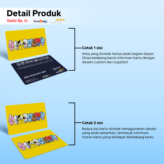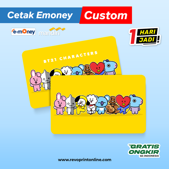 Cetak kartu emoney custom bisa order satuan cepat berkualitas, e-Money sendiri merupakan produk yang diterbitkan oleh Bank Mandiri dalam bentuk kartu untuk melayani kebutuhan transaksi digital di Indonesia. Dengan menggunakan e-Money Mandiri, anda bisa melakukan berbagai transaksi digital sebagai pengganti transaksi tunai seperti pembayaran tol, pembayaran parkir, pembayaran transportasi umum (kereta, transjakarta, dll). REVO Print kini telah menyediakan layanan cetak e-Money dengan metode printing UV, mampu memberikan kualitas hasil cetak terbaik dengan detail yg lebih tajam dan daya tahan tinta yang lebih kuat.