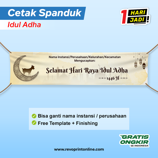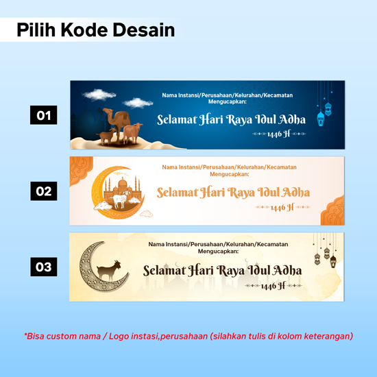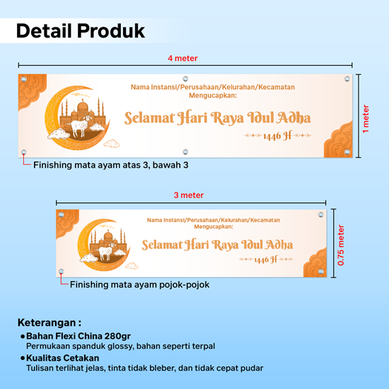 Cetak Spanduk selamat hari raya Idul Adha untuk perayaan Hari Raya Idul Adha/Lebaran Haji bahan flexi 1 Hari jadi, Pilih motif desain yang kamu sukai dan bisa custom nama / logo instansi, nama tempat.